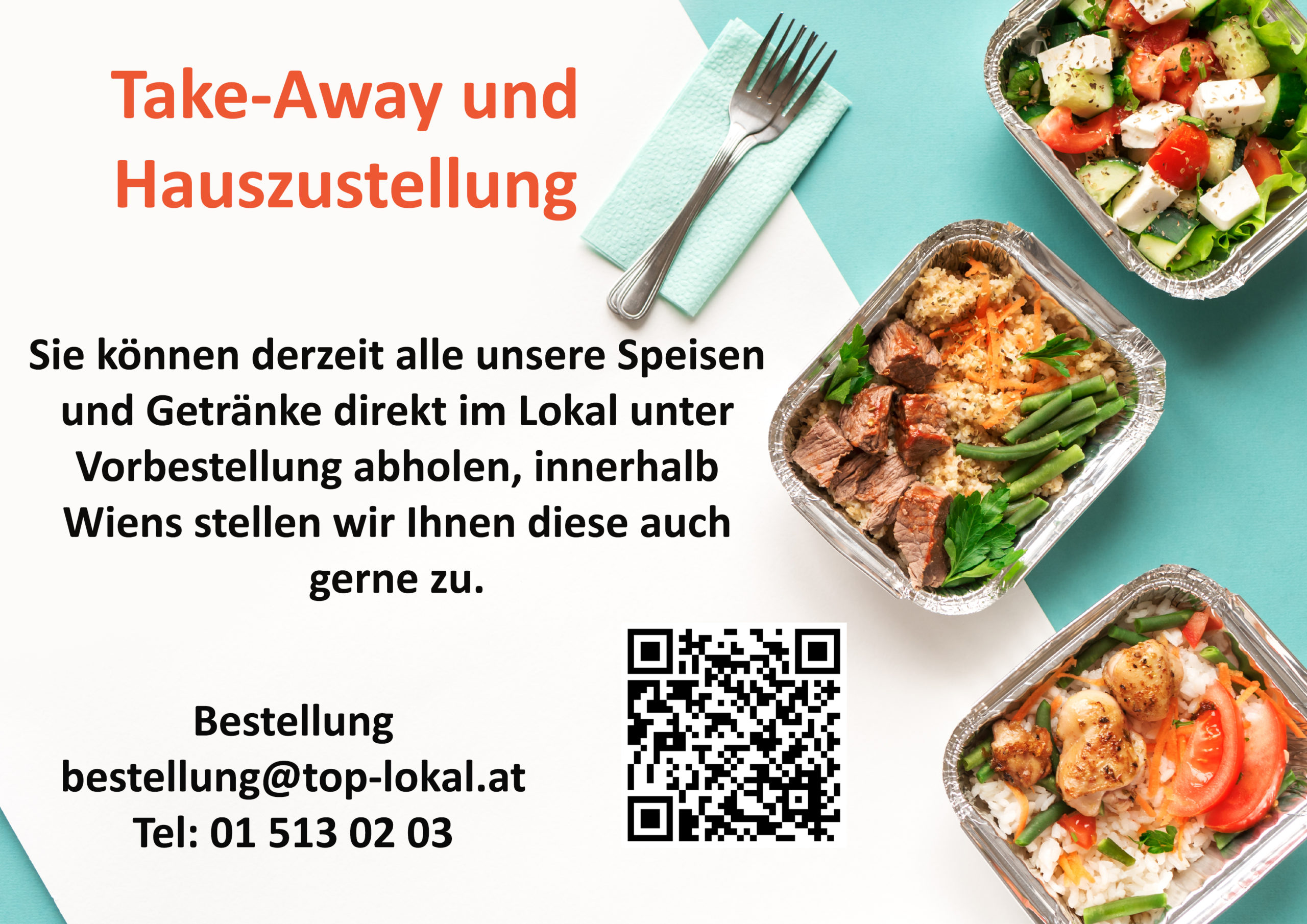 Alle unsere Speisen sind zur Zeit als TAKE AWAY im Lokal erhältlich. Gerne stellen wir innerhalb Wiens auch zu Ihnen nach Hause zu. Telefonische Bestellungen unter 01 513 02 03 von 9:00 bis 14:30 oder als E-Mail an bestellung@developer.top-lokal.at